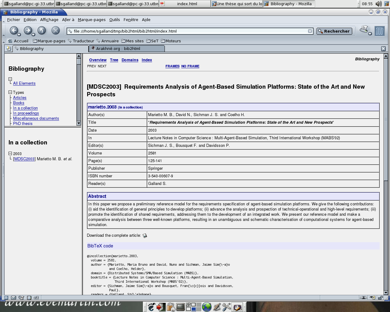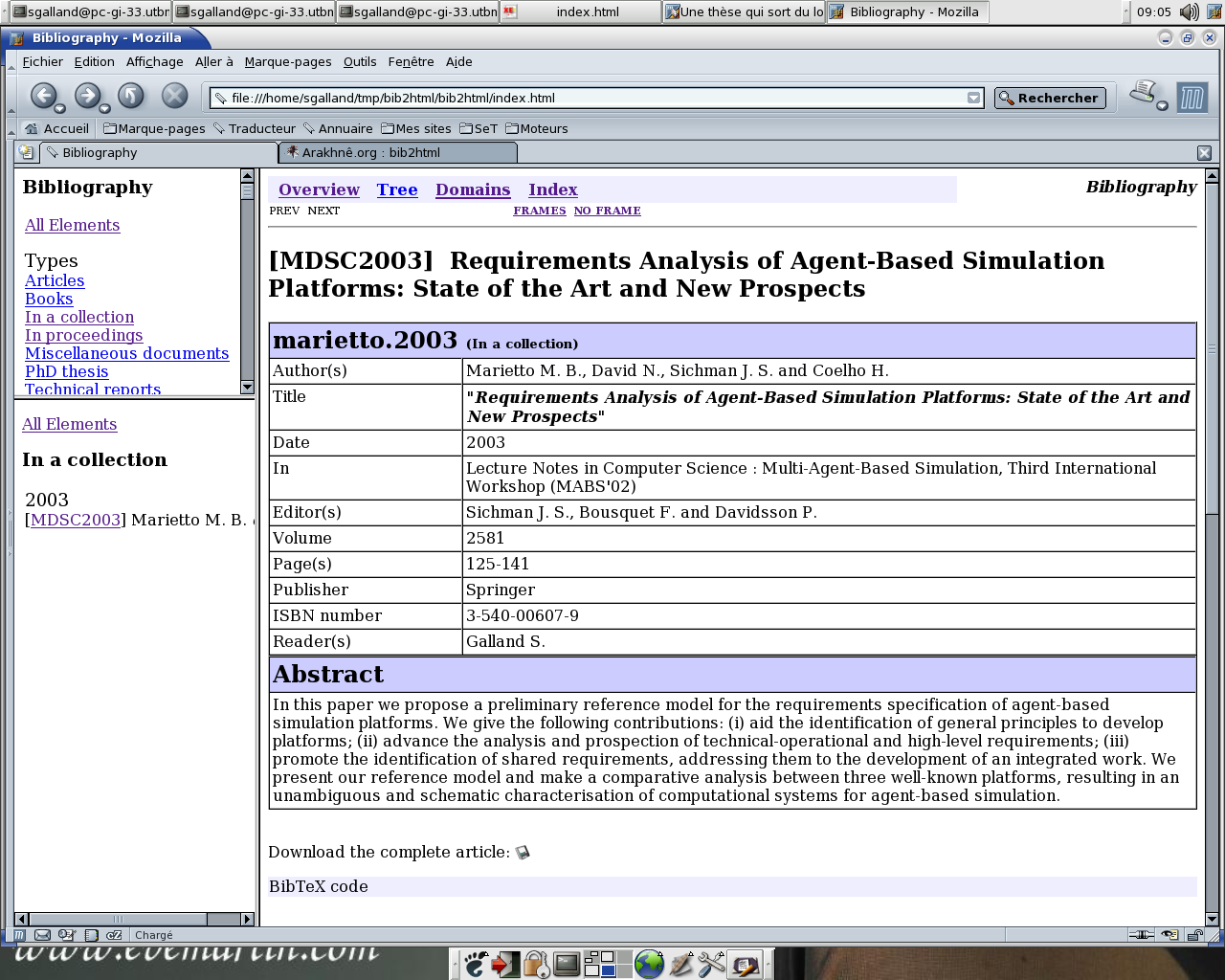 The output depends of the used theme. But the pages' hierarchy has a similar structure that the JavaDoc's ones (see the two screenshots generated with the theme Simple and the theme Dyna). It includes a overview page, an index, an list of scientifical domains in which the BibTeX's entries are...